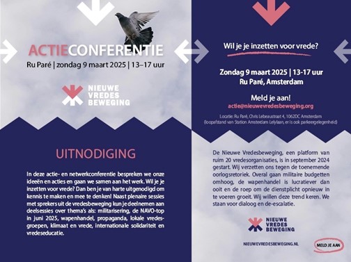 Van Henk Baars, 2of3bijEEN vertegenwoordiger in de beraadsgroep ‘Samenleving, duurzaamheid en vrede’ van de Raad van Kerken Nederland, ontvingen wij het verzoek jullie op de hoogte te brengen van de Actieconferentie op 9 maart a.s. in Amsterdam ‘Wil je je inzetten voor vrede’.
