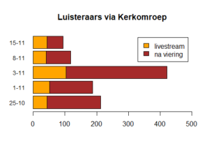 In deze grafiek staat het aantal thuisluisteraars vanaf 25 oktober 2020, het begin van de livestreamvieringen via de Kerkomroep. De oranje balk in de grafiek toont het aantal luisteraars van de live uitzending, dus tijdens de Peperviering zelf. Daarnaast beluisteren veel mensen de vieringen later. De bruine balk in de grafiek toont het aantal mensen dat na de live viering t/m 15 november de betreffende viering heeft beluisterd. Vooral bij recente vieringen loopt dit aantal nog op.